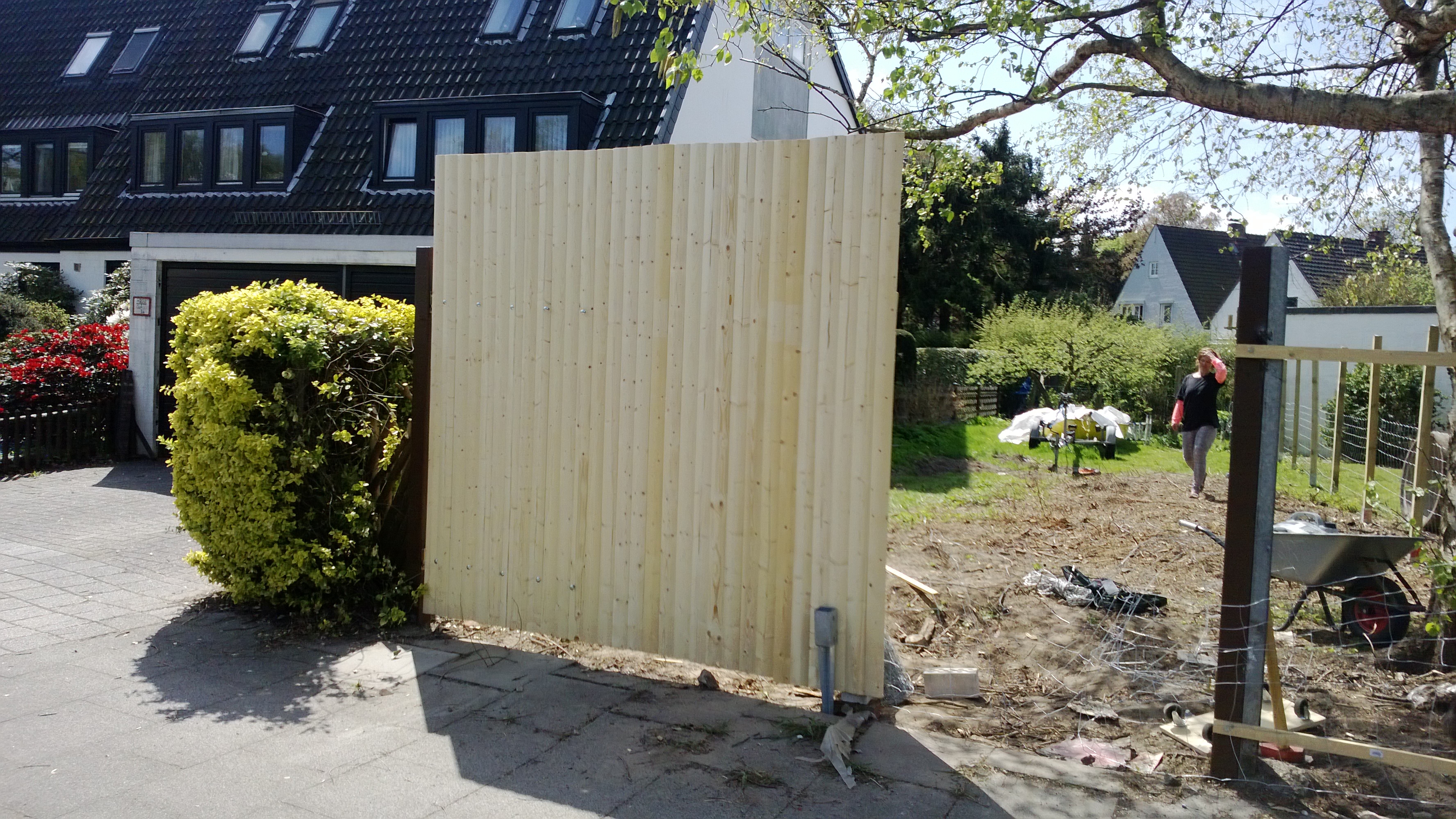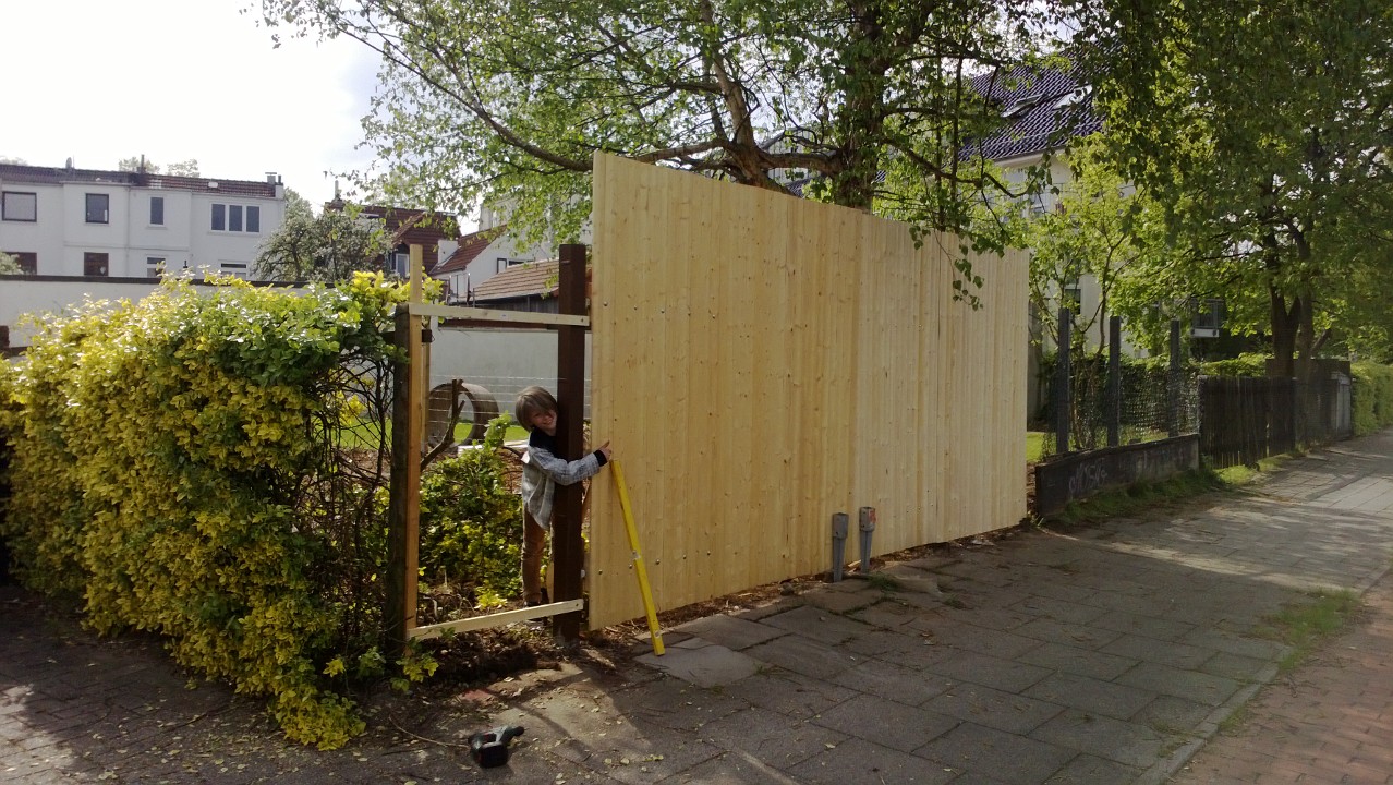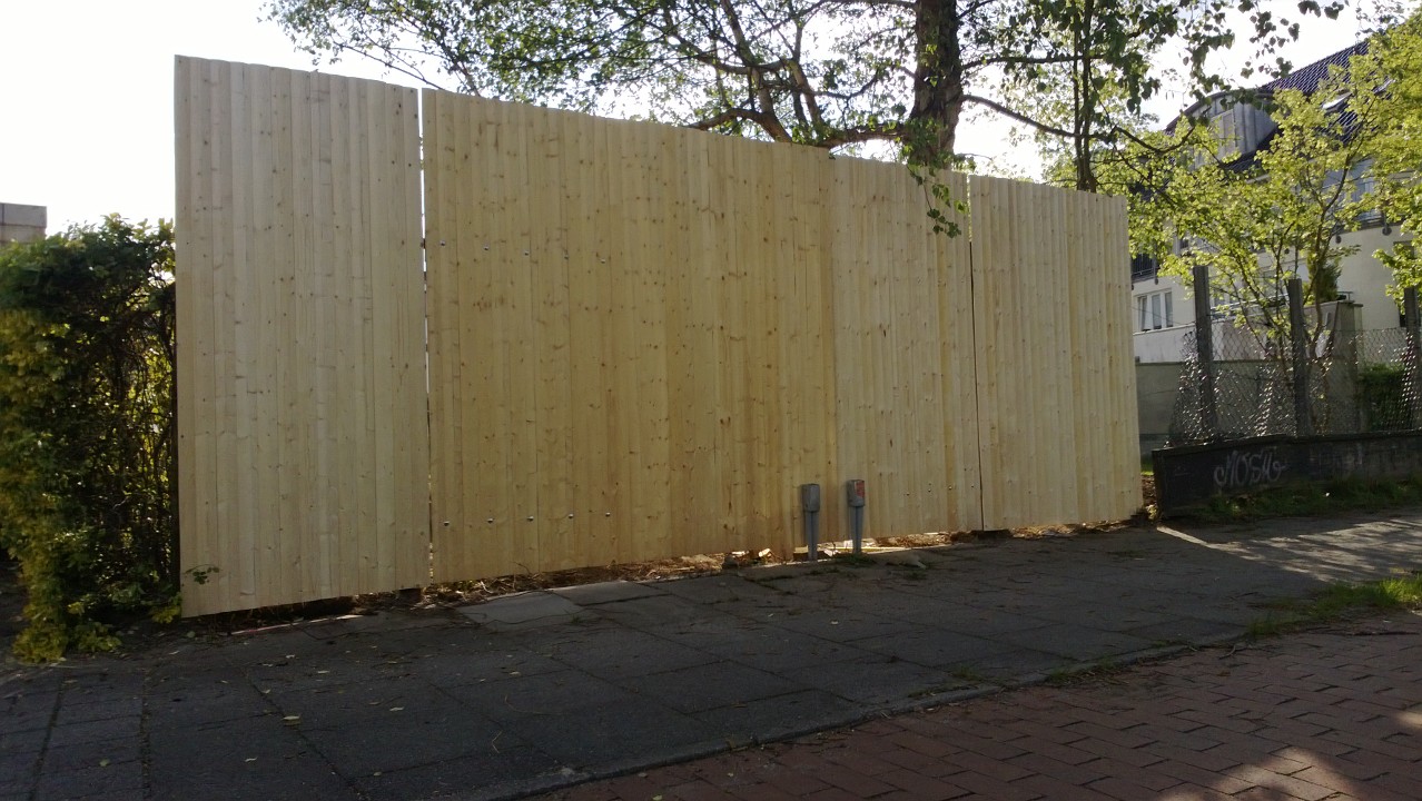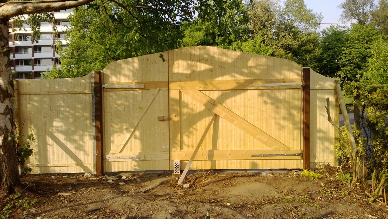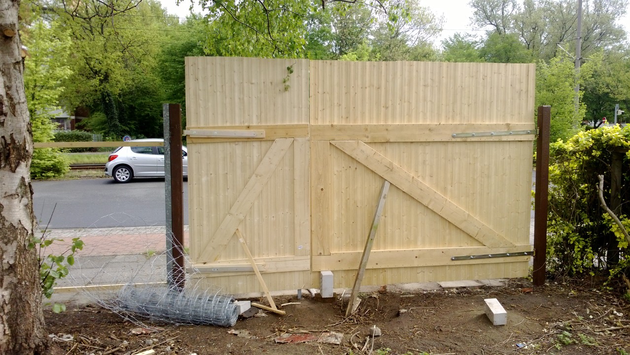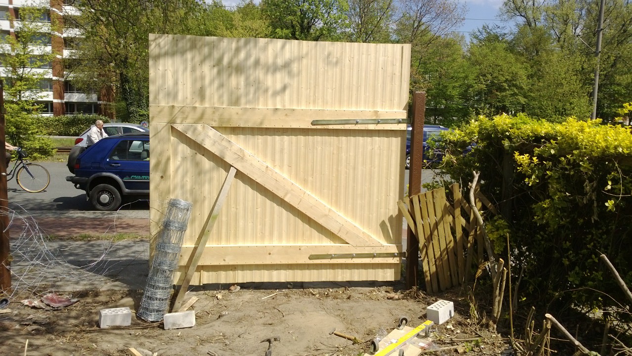 Nachtrag Juli 2014: Aufgrund der im Herbst in Norddeutschland ständig auftretenden, meist westlichen starken Winde und der westlichen Ausrichtung des Tores wurde die Aufnahme des Lastpunktes in das Erdreich mit einem Betonfundament und des unteren Bereichs des grösseren Torflügels mit 40mm Holzbohlen verstärkt. Erfahrungen mit Abstagungen aus Zurrgurten (halten bei östlichen Winden natürlich nicht) und den möglicherweise auch mal östl. Winden in den Wintermonaten mündeten in eine Installation von 20mm abnehmbaren Stahlstagen mit entsprechenden Fundament.